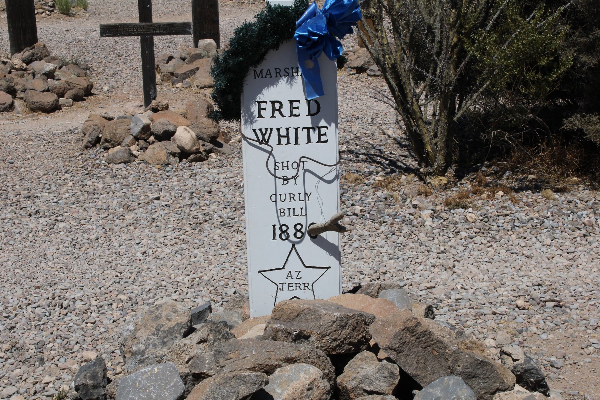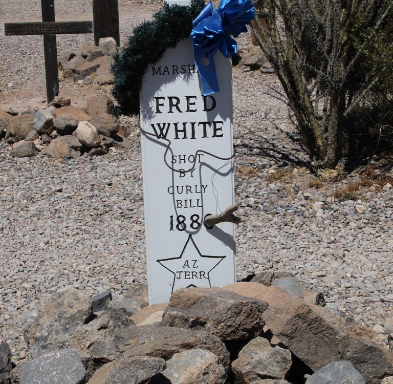 Marshal Fred White was shot and killed by a group of Five outlaws who were shooting up the town. When Marshal White asked the leader to stop shooting the man walked up to him. The man's gun discharged as Marshall White Grabbed the barrel and pulled it towards him.