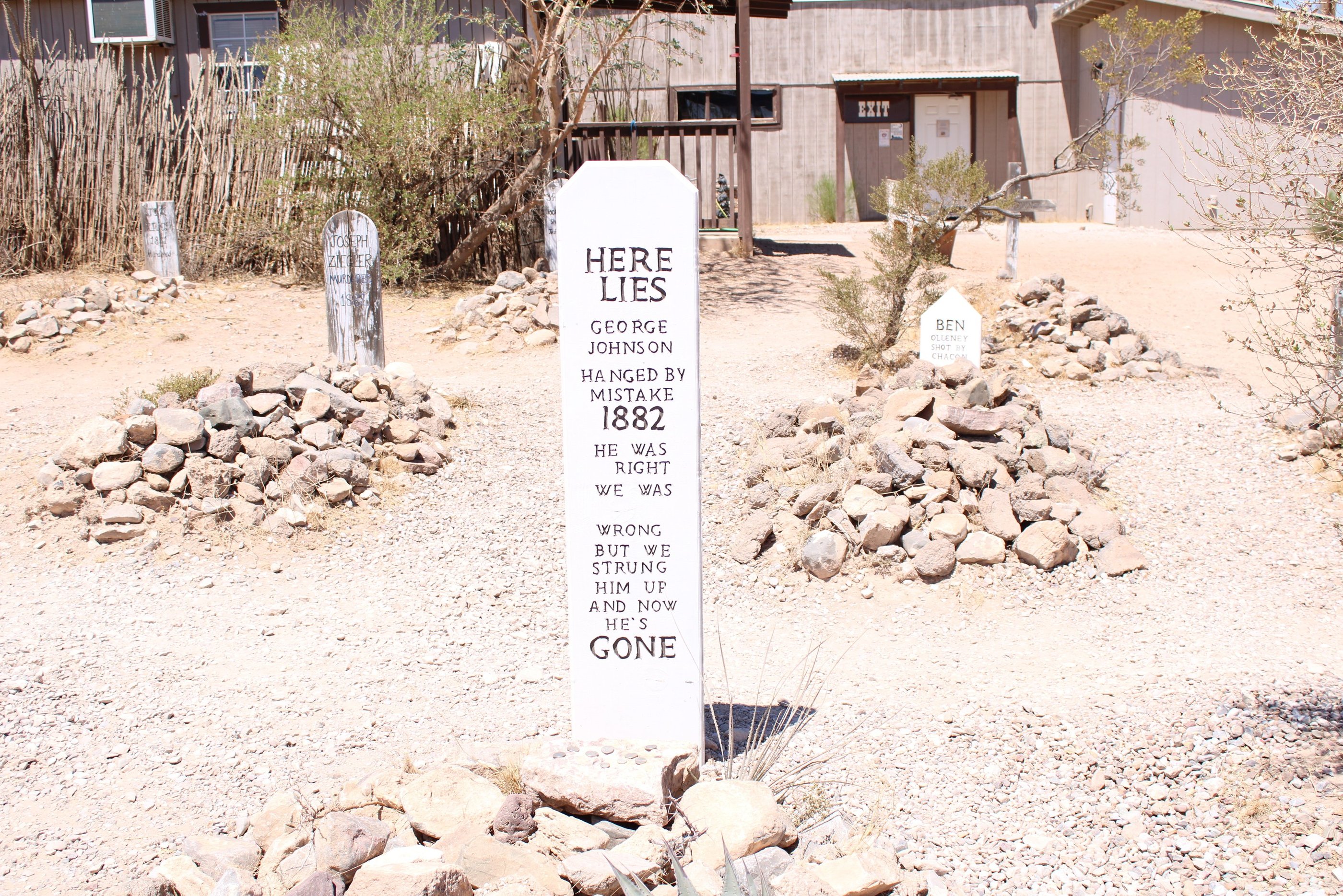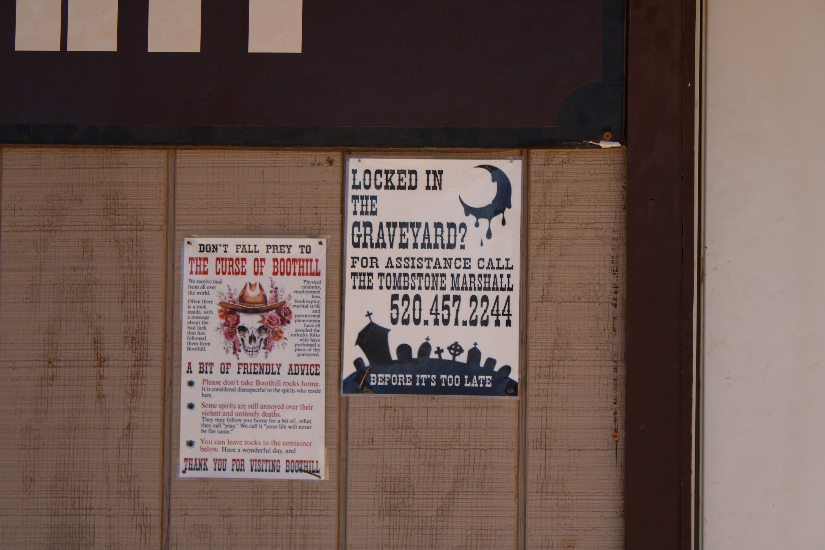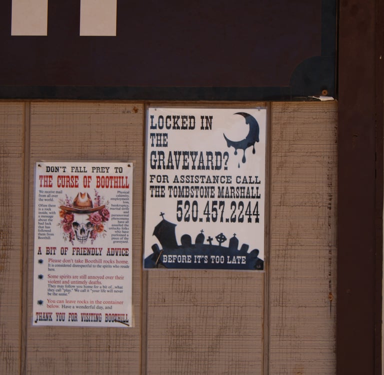 Legit the sign as we were leaving. I find it interesting that People would take stones from boot hill home. Its a cemetery. So I would leave everything as is. But I guess taking home a rock from Boothill is cursed. I wish hope the Image is clear for you guys as that's the only one I have. But essentially great calamity have befallen those who have taken a rock from the Cemetery.
